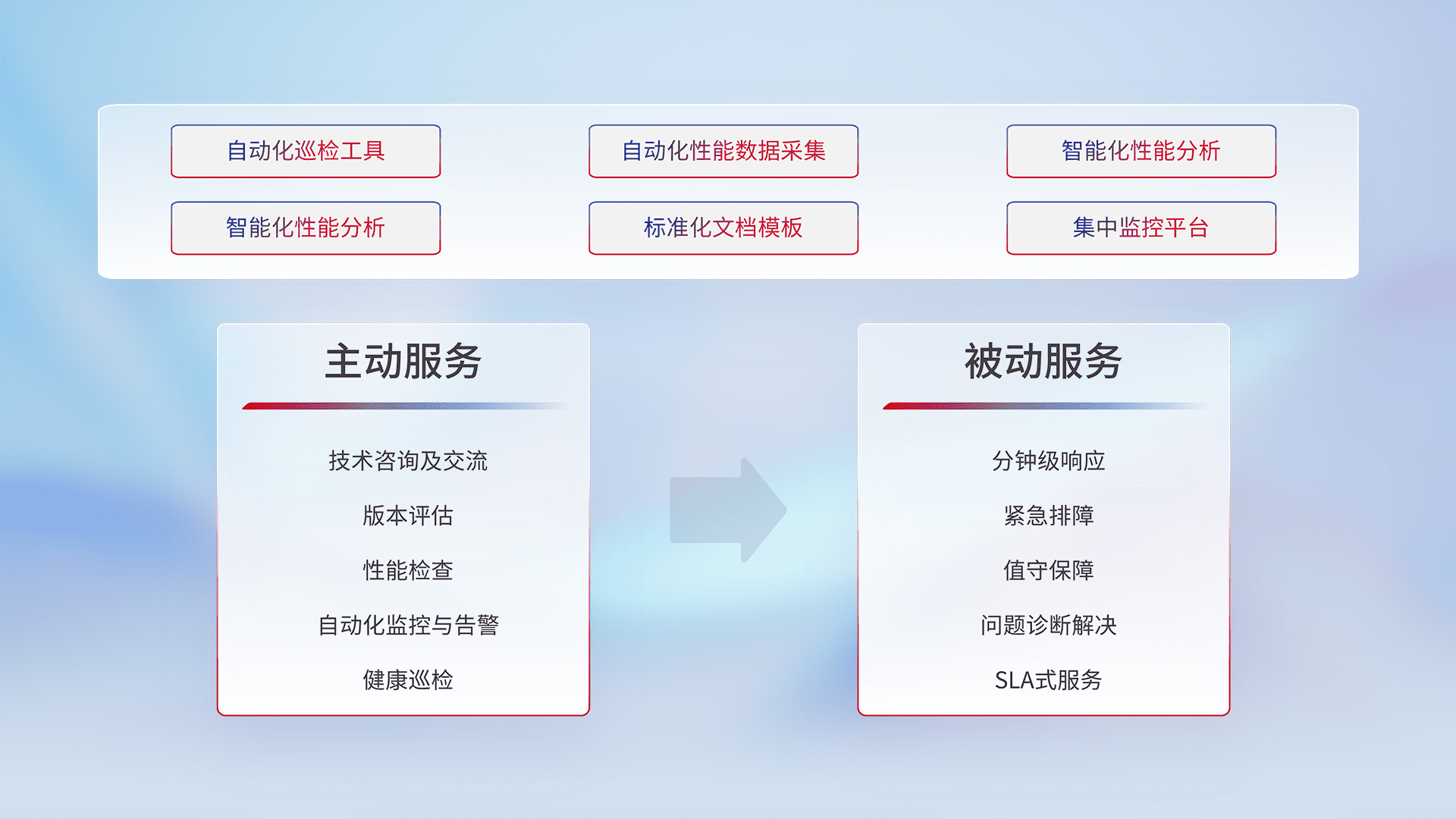 智能化工具和标准化文档,,保障服务质量,,,,提供主动服务(包含技术咨询、、、版本评估、、、性能检查、、自动化监控与告警、、健康巡检)和被动服务包含(分钟级响应、、紧急排障、、、值守保障、、、、问题诊断解决、、、SLA服务)。。。