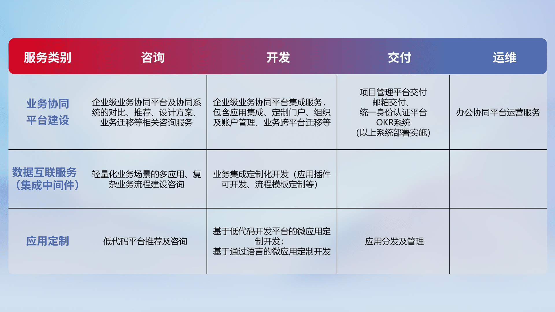 针对钉钉、、、企微、、、、IDaas等平台级产品提供产品的规划、、方案、、、交付、、、定制化开发等服务,,,实现如统一协同办公、、智能客户服务、、、、混合会议管理、、、智能数据查询、、等业务场景,,实现数字化转型。。。。